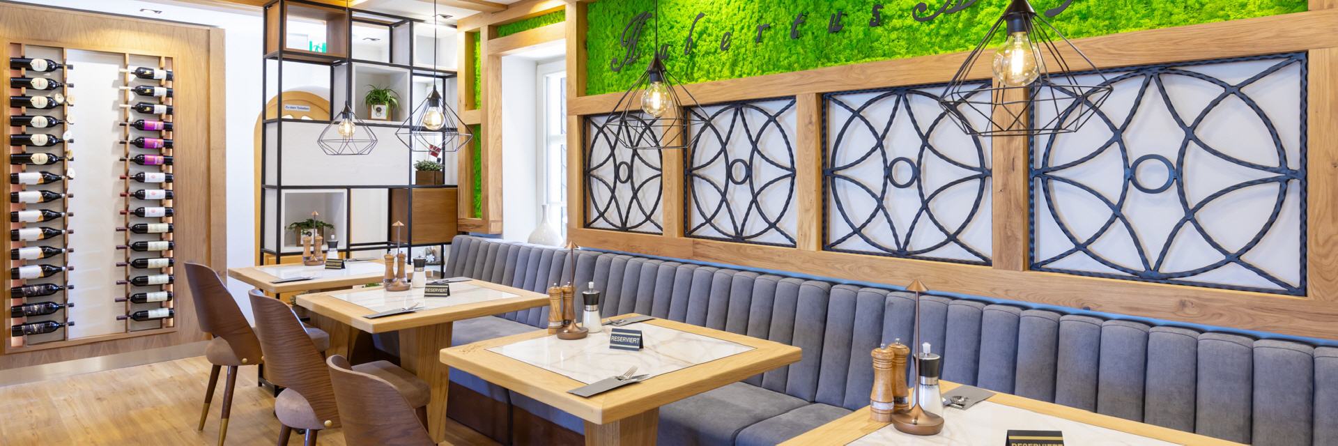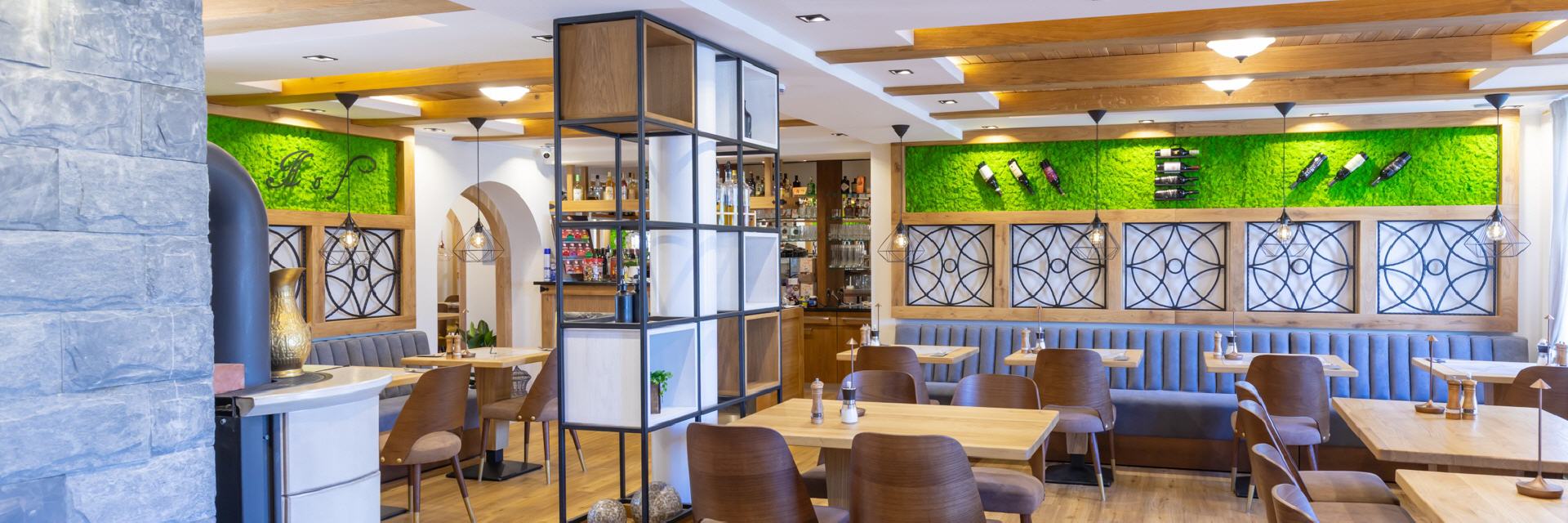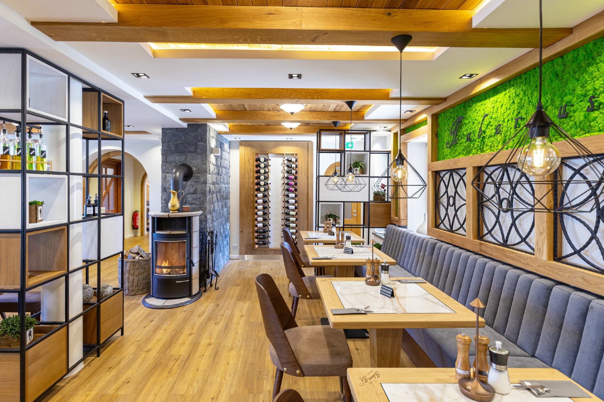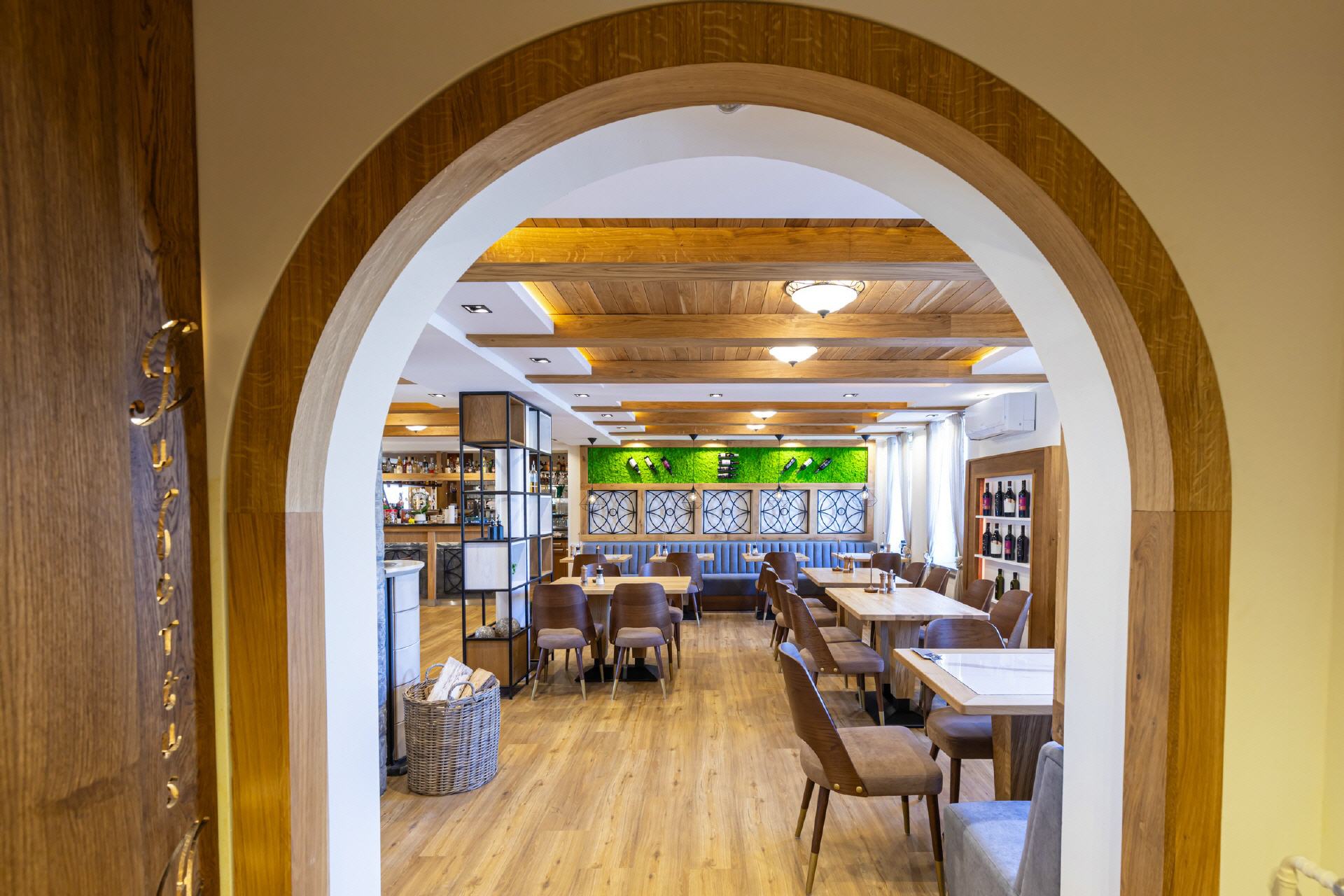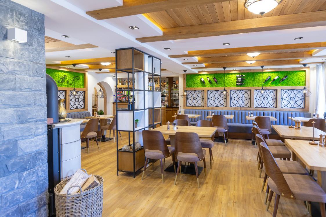 Unser Restaurant wurde bis Anfang April 2025 vollständig umgebaut und renoviert. Bei der Einrichtung wurde sehr viel Wert auf unzählige Details gelegt, es gibt für die Gäste also viel zu entdecken. Wandelemente mit dem in „Rasen“ eingebetteten Hotelnamen, die luftigen Raumteiler oder die verteilten Weinregale. Selbstverständlich ist Holz eines der prägenden Elemente, helle Balken, helle Wände und Decken, modernes Mobiliar - entstanden ist ein gemütliches, stylisches Ambiente, das für eine moderne Wohlfühlatmosphäre sorgt. Ein besonderes Feeling entsteht durch das knisternde Feuer im zentralen Kamin.