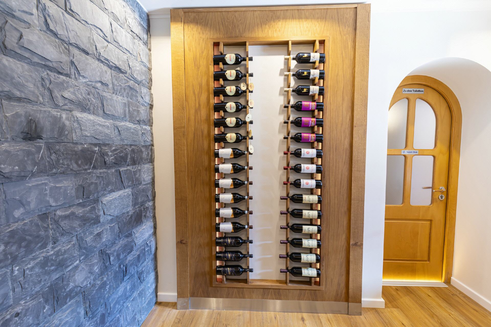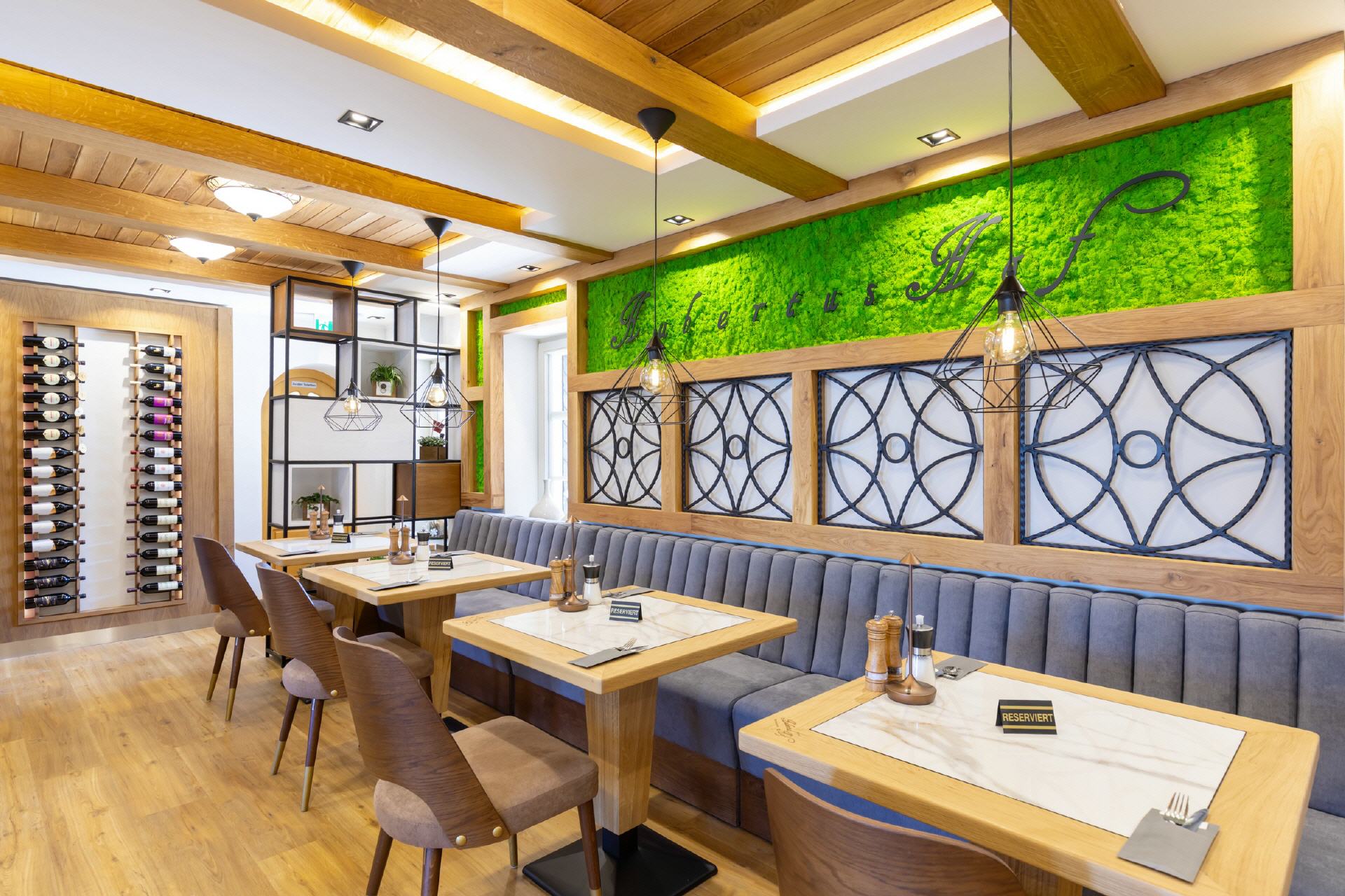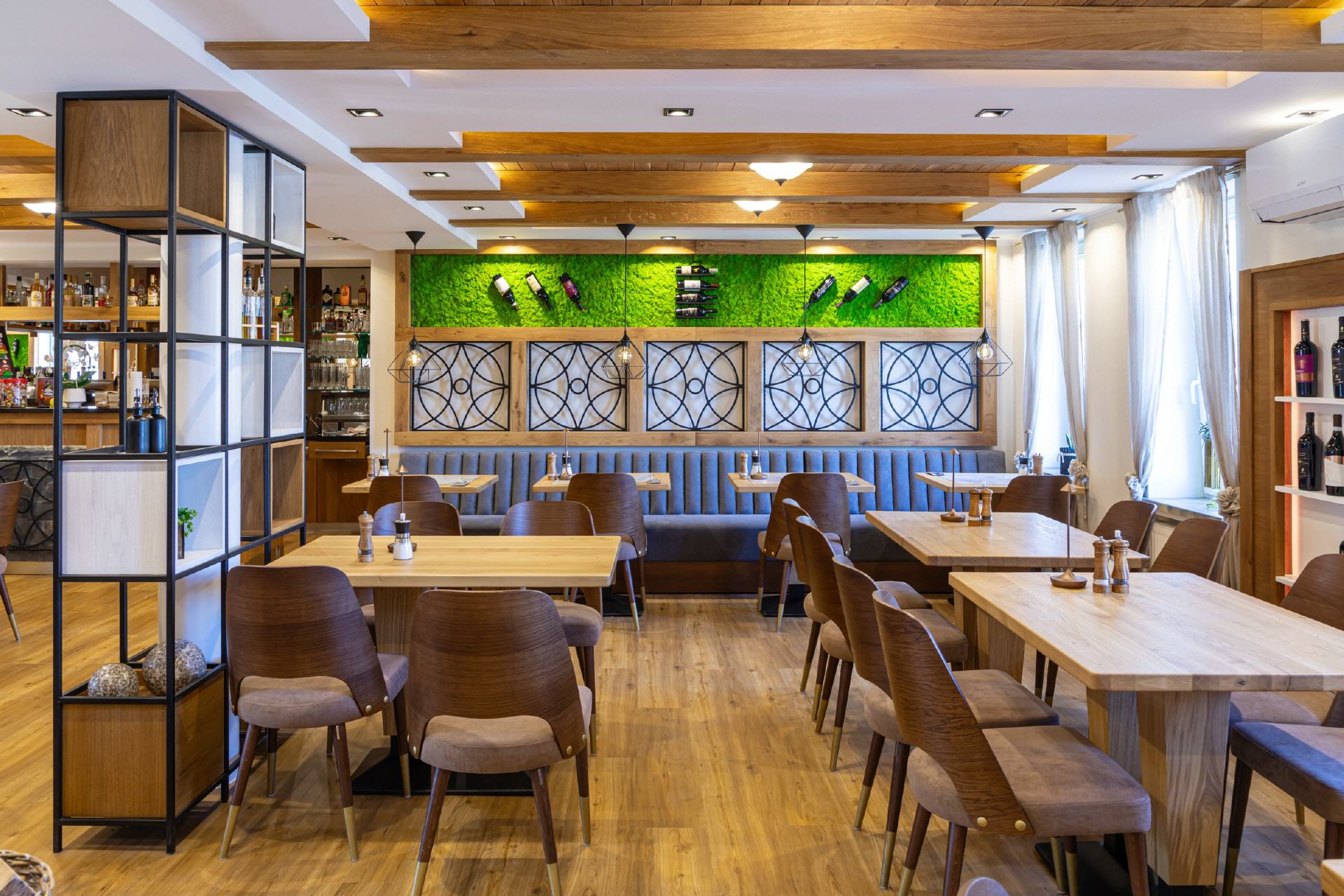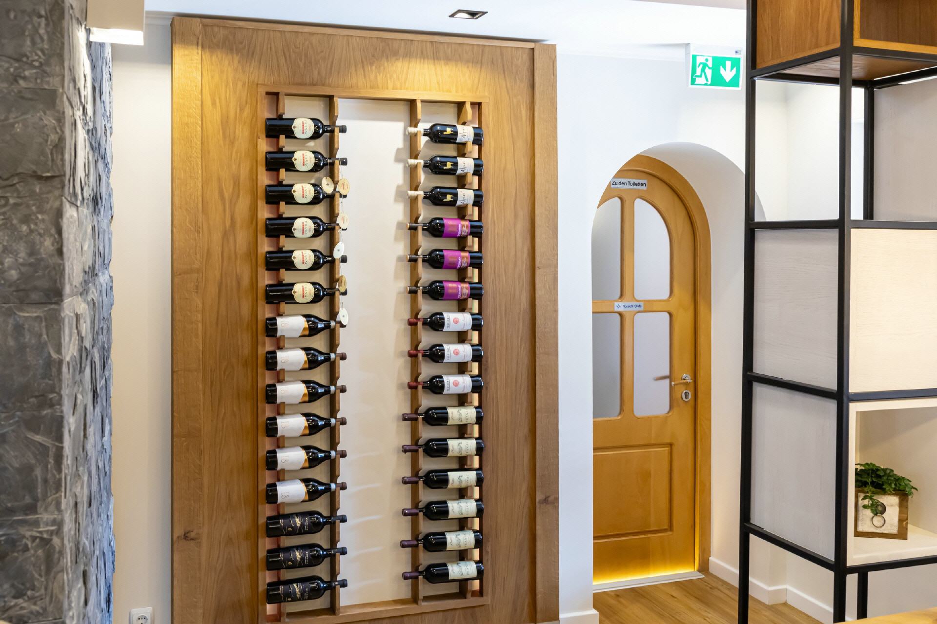 Unser Restaurant wurde bis Anfang April 2025 vollständig umgebaut und renoviert. Bei der Einrichtung wurde sehr viel Wert auf unzählige Details gelegt, es gibt für die Gäste also viel zu entdecken. Wandelemente mit dem in „Rasen“ eingebetteten Hotelnamen, die luftigen Raumteiler oder die verteilten Weinregale. Selbstverständlich ist Holz eines der prägenden Elemente, helle Balken, helle Wände und Decken, modernes Mobiliar - entstanden ist ein gemütliches, stylisches Ambiente, das für eine moderne Wohlfühlatmosphäre sorgt. Ein besonderes Feeling entsteht durch das knisternde Feuer im zentralen Kamin.