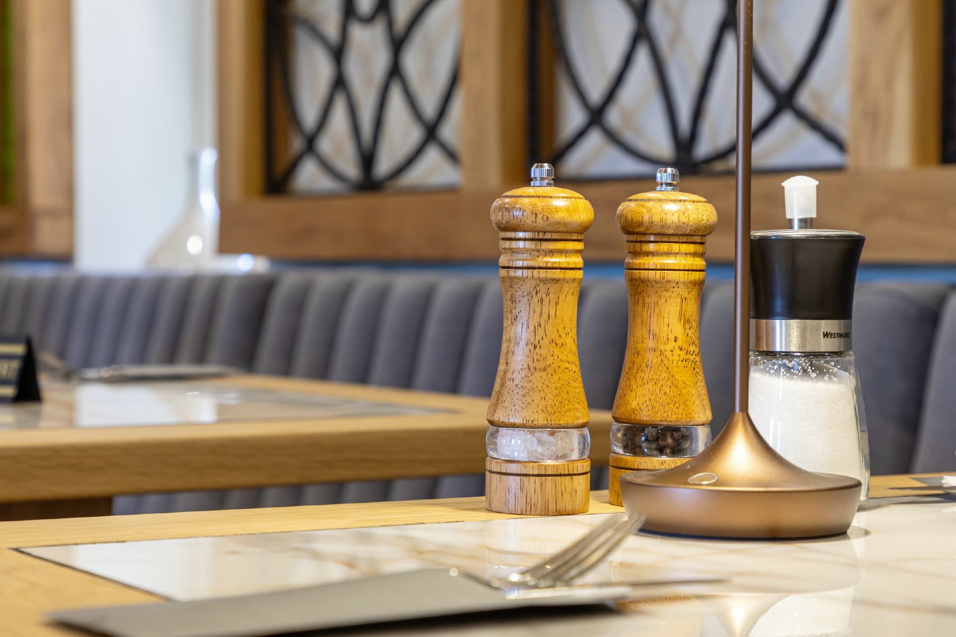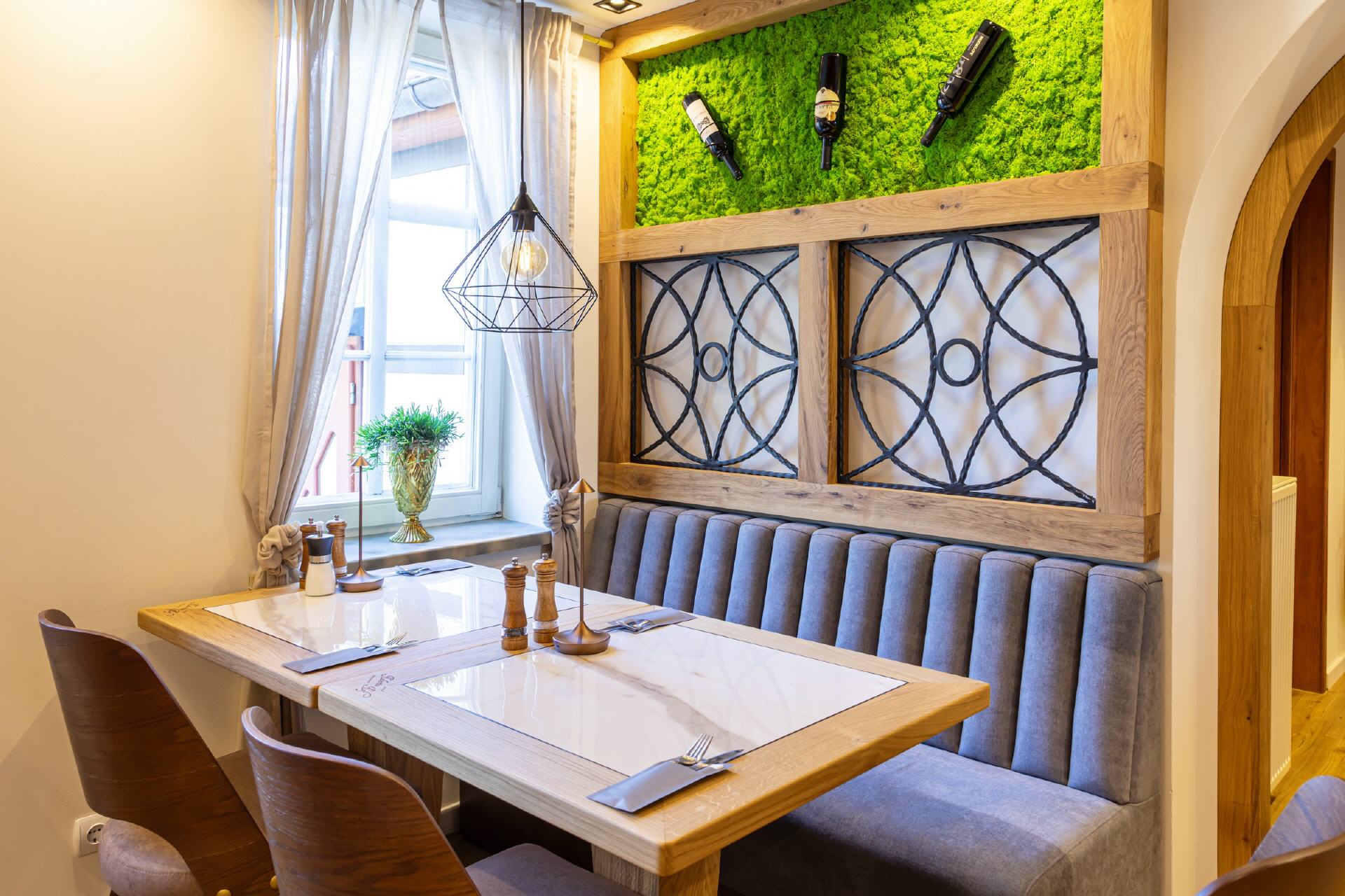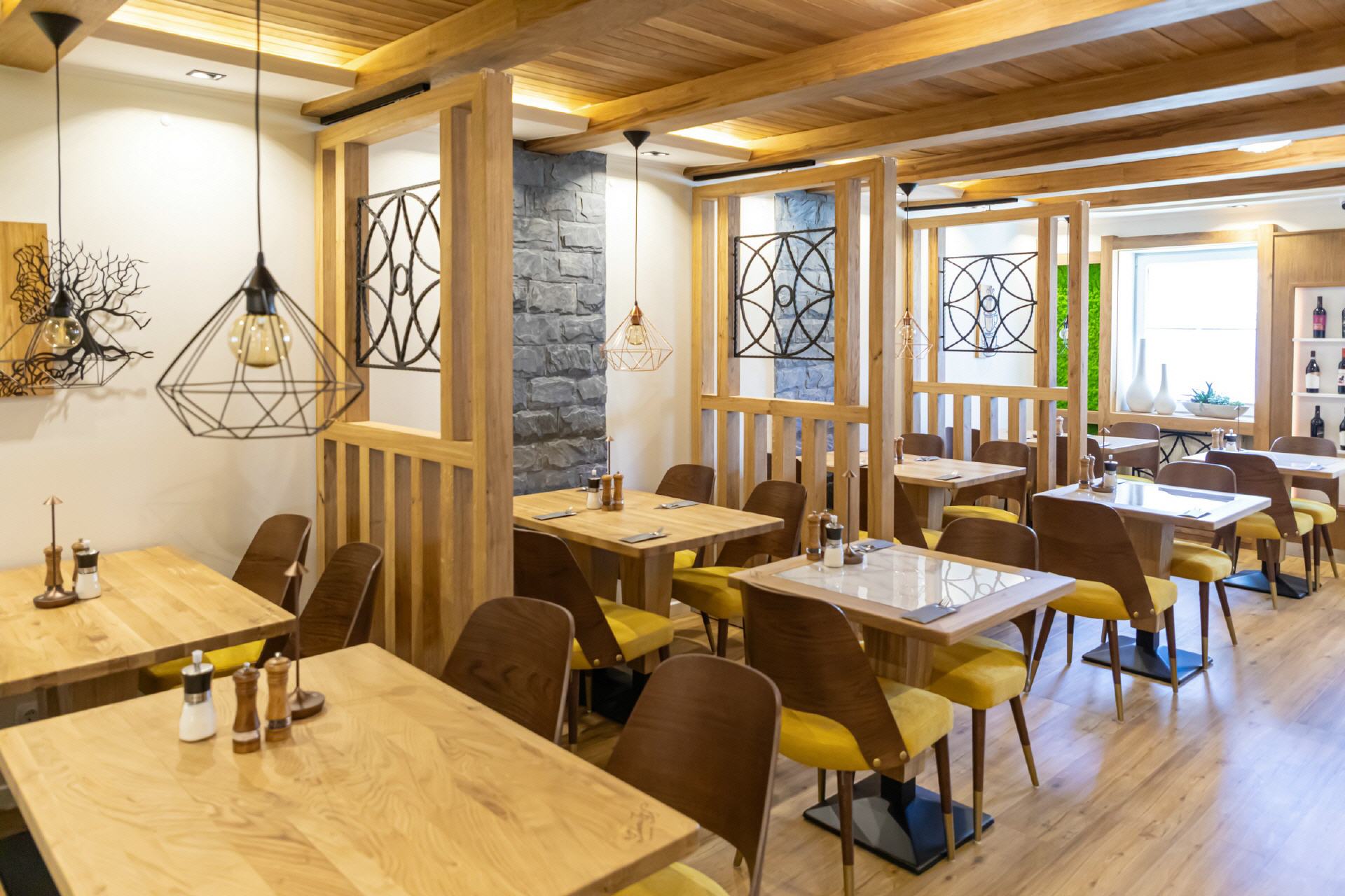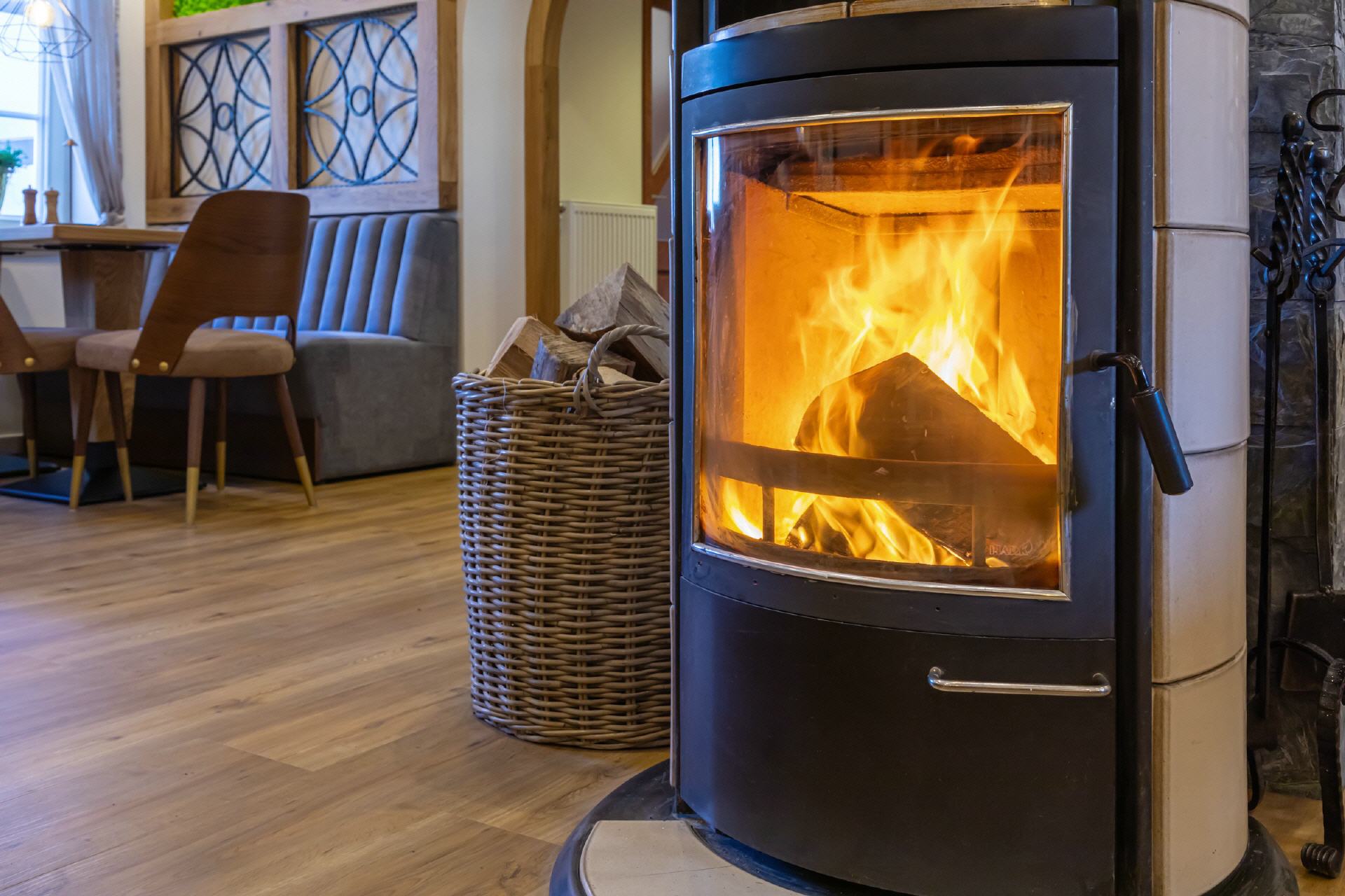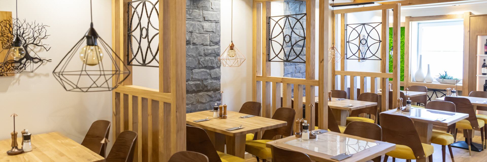 Unser Restaurant wurde bis Anfang April 2025 vollständig umgebaut und renoviert. Bei der Einrichtung wurde sehr viel Wert auf unzählige Details gelegt, es gibt für die Gäste also viel zu entdecken. Wandelemente mit dem in „Rasen“ eingebetteten Hotelnamen, die luftigen Raumteiler oder die verteilten Weinregale. Selbstverständlich ist Holz eines der prägenden Elemente, helle Balken, helle Wände und Decken, modernes Mobiliar - entstanden ist ein gemütliches, stylisches Ambiente, das für eine moderne Wohlfühlatmosphäre sorgt. Ein besonderes Feeling entsteht durch das knisternde Feuer im zentralen Kamin.