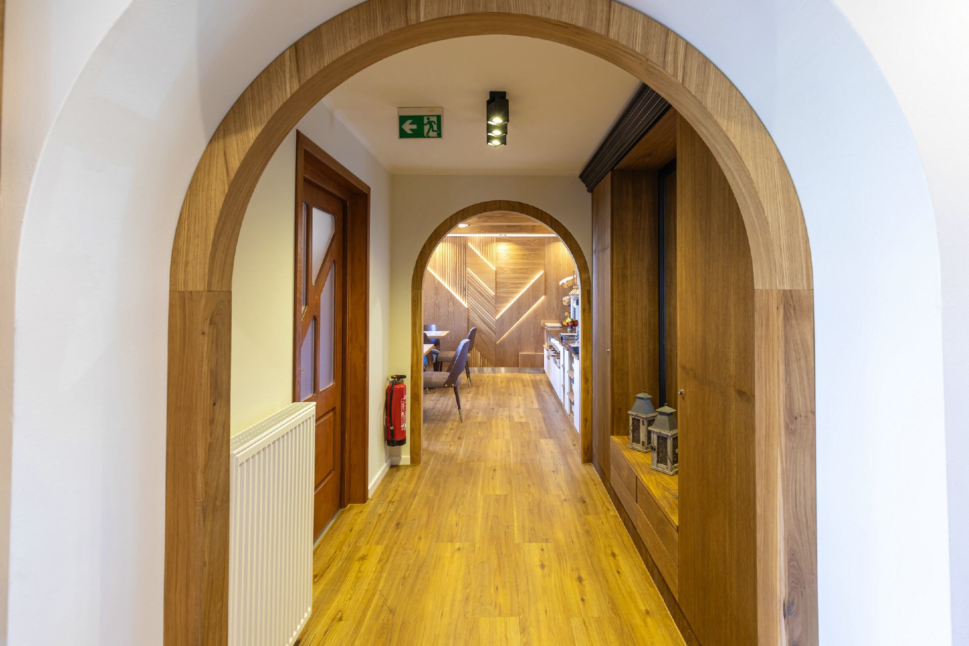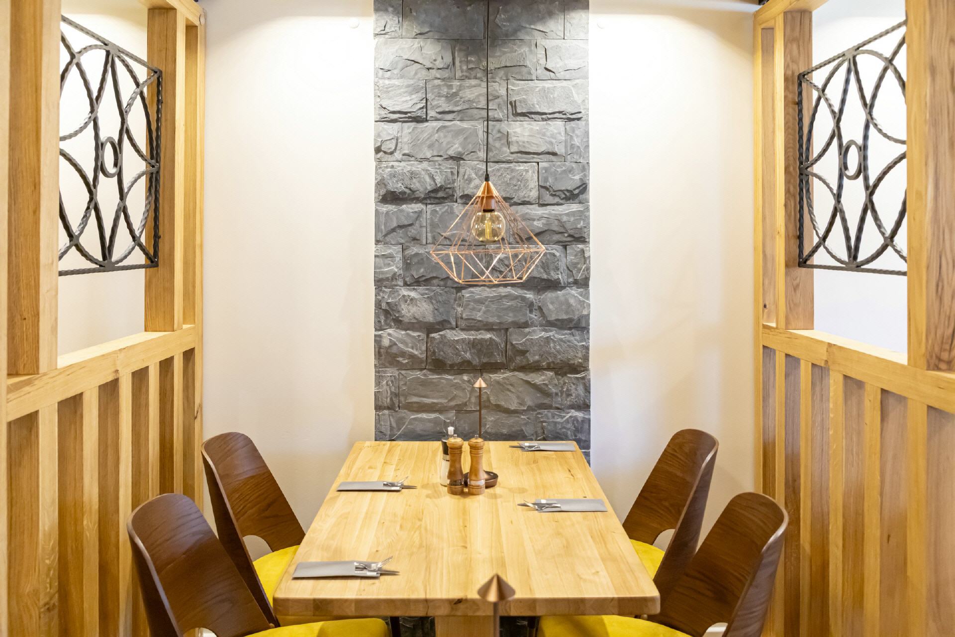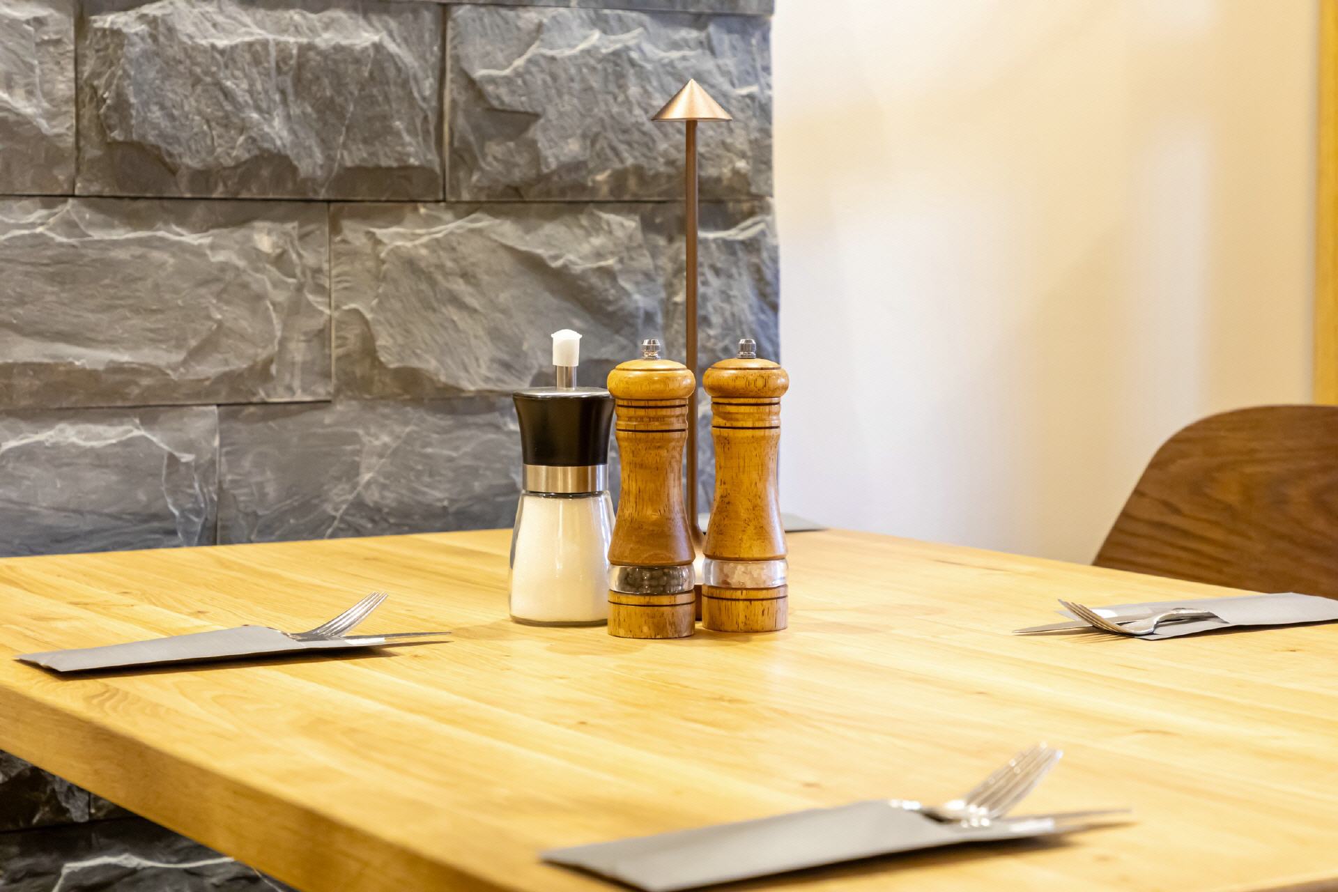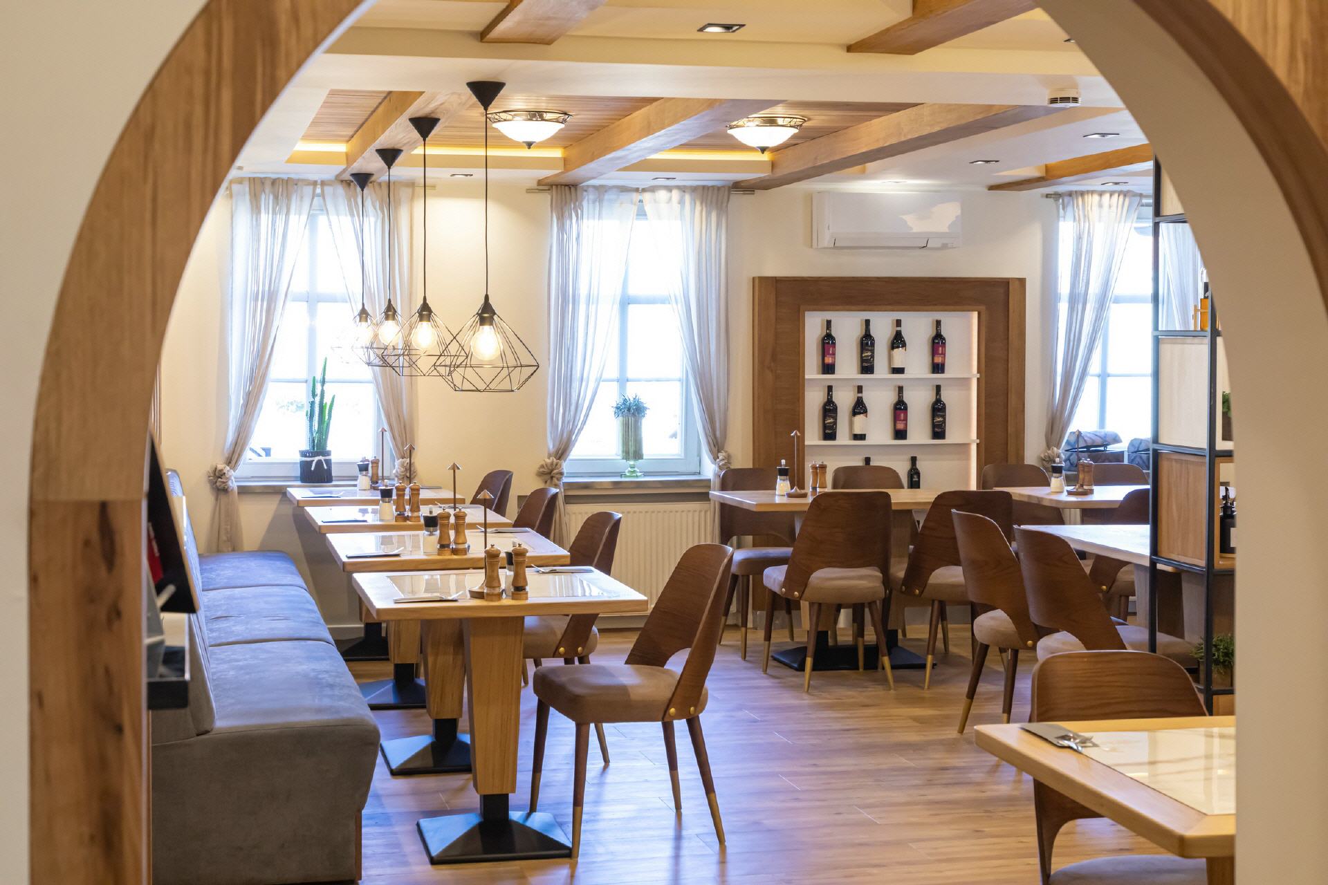 Unser Restaurant wurde bis Anfang April 2025 vollständig umgebaut und renoviert. Bei der Einrichtung wurde sehr viel Wert auf unzählige Details gelegt, es gibt für die Gäste also viel zu entdecken. Wandelemente mit dem in „Rasen“ eingebetteten Hotelnamen, die luftigen Raumteiler oder die verteilten Weinregale. Selbstverständlich ist Holz eines der prägenden Elemente, helle Balken, helle Wände und Decken, modernes Mobiliar - entstanden ist ein gemütliches, stylisches Ambiente, das für eine moderne Wohlfühlatmosphäre sorgt. Ein besonderes Feeling entsteht durch das knisternde Feuer im zentralen Kamin.